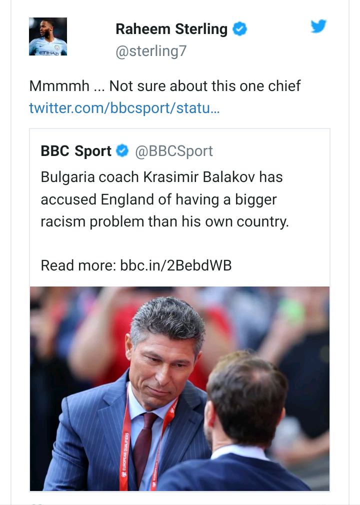Raheem Sterling responded to claims from Bulgaria’s manager regarding the racism problem in England after some Three Lions stars were the subject of racist abuse in Sofia tonight.