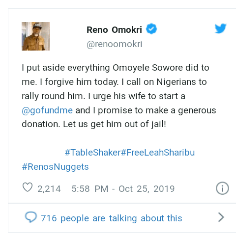 He tweeted, “I put aside everything Omoyele Sowore
